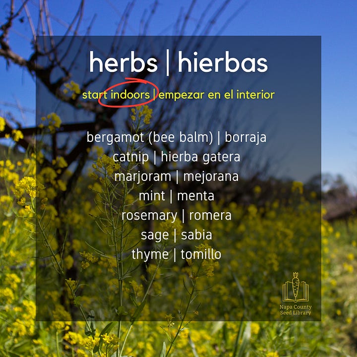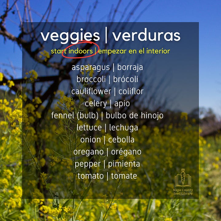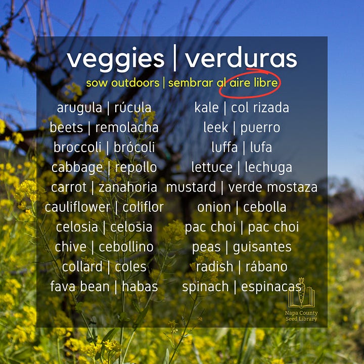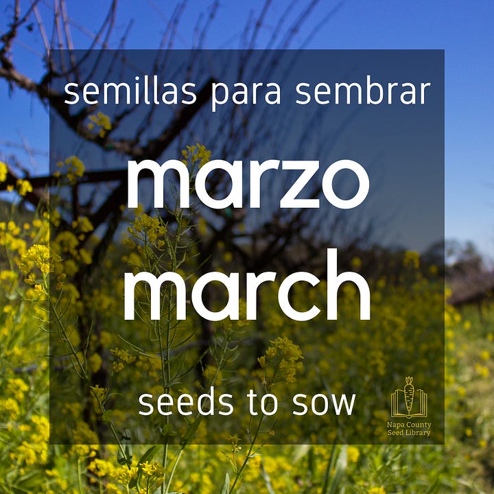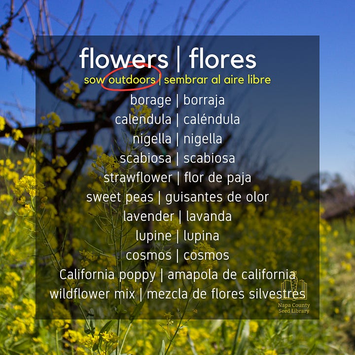 Each of the seeds listed in this section can be planted (“sown”) directly into workable soil at this time in Zone 9b (Napa County’s USDA growing zone designation). Some seeds germinate best with help from sunlight, while others need to be buried deep underneath the soil. Follow the directions on the seed packet, or, using a general rule, plant a seed twice as deep as its widest side (its width or its length). Find out (search online) what particular conditions your seeds need to sprout.